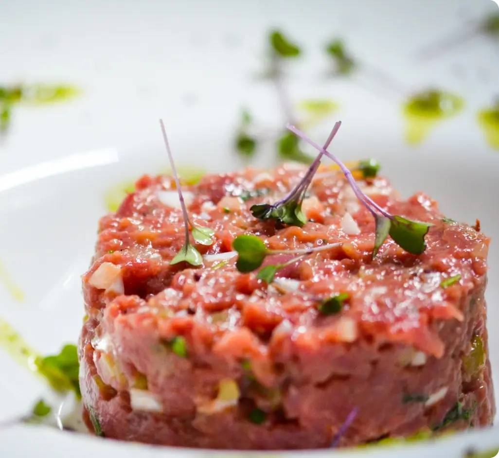 Forret 3: Carpaccio m. aioli, lagret unika ost, syltede sennepskorn, svampe , sprødt & karseurter